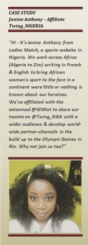 Conscious of the plethora of WomenSports channels opening up worldwide - The Women's Sports Network has set up affiliations with WomenSports 'Twournalists' around the world to coordinate and consolidate content/reports AND empower hundreds of independent journalists worldwide - all currently tweeting in isolation.  TwingNET is already making some 20 million twitter impacts per week. Seventy five 'affiliate' 'Twournalists' around the world now have access to one, or several, of the Twing_IT channels and are all passionately tweeting about Women's Sports News to our 60k community!.