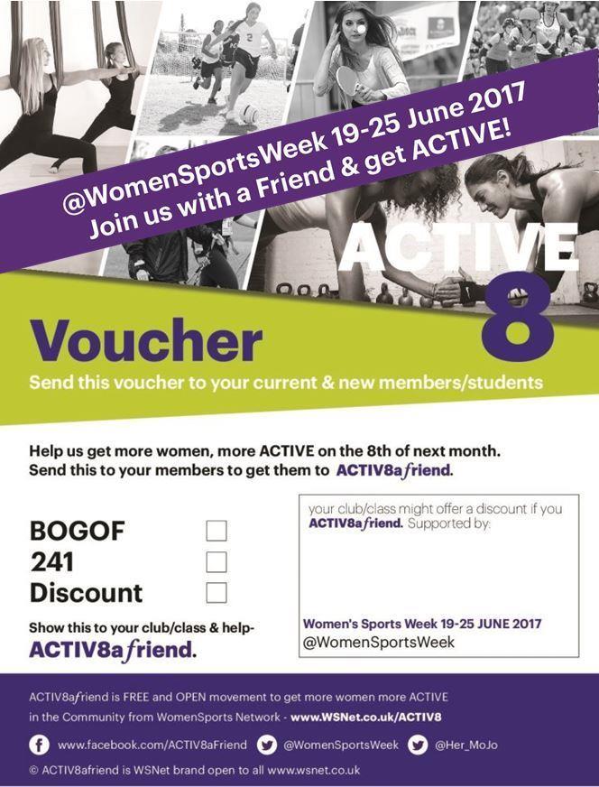 • ​VOUCHER - download the 'discount' voucher on the right and send it out to your female members - for them to 'nudge' & invite to your club during WomenSportsWeek! Or try taking it to your local fitness class
