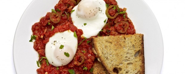 HOW Fry chopped red onions and minced garlic in a little water. Add tinned tomatoes, some chopped chillies and seasoning. When it's thickened, make two holes in the sauce, crack in the eggs and cover so they poach. Serve with a drizzle of olive oil, fresh parsley and rye toast.